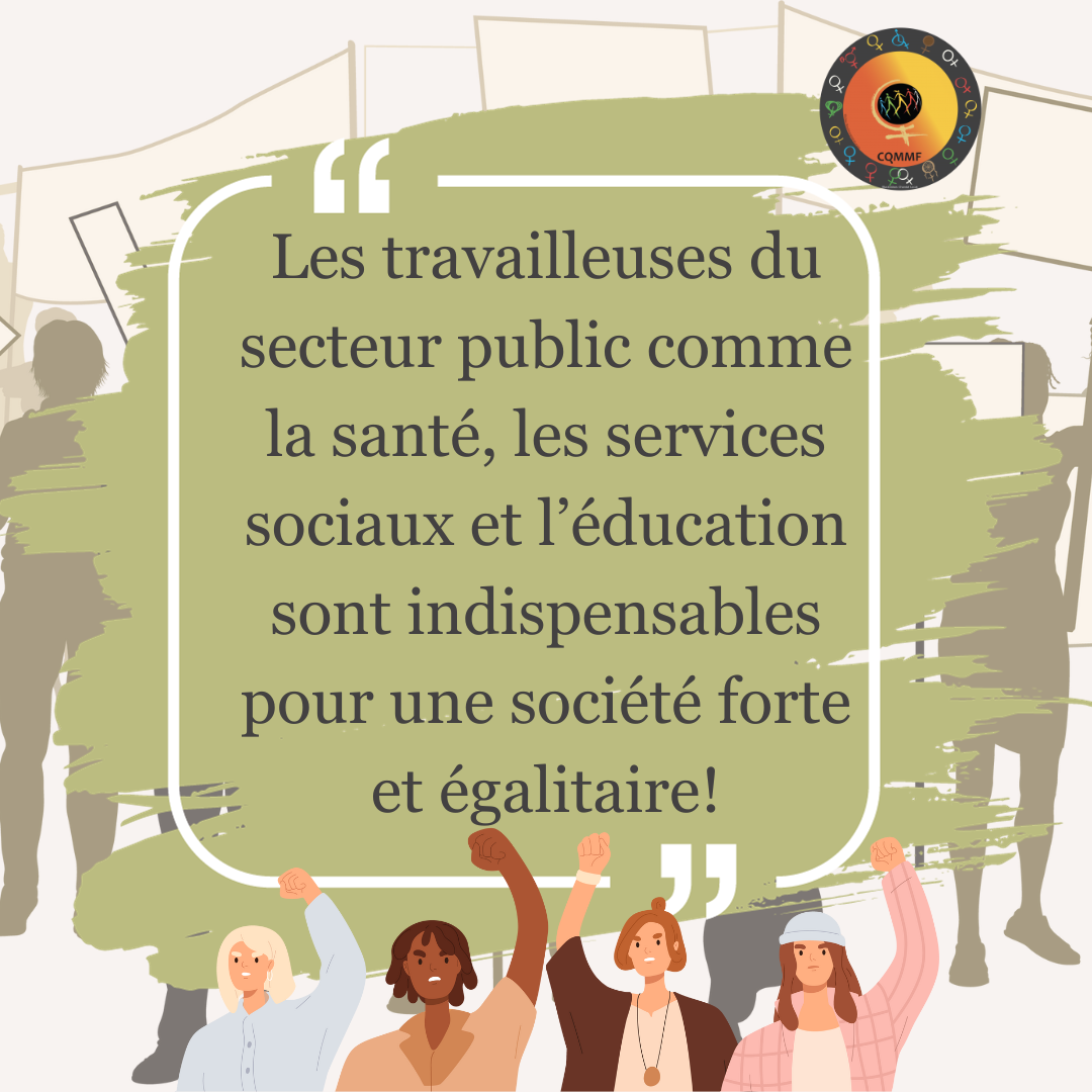 La Coordination du Québec de la Marche mondiale des femmes (CQMMF) appuie les travailleuses et travailleurs des organisations syndicales du secteur public qui négocient pour une amélioration des conditions d'emploi.