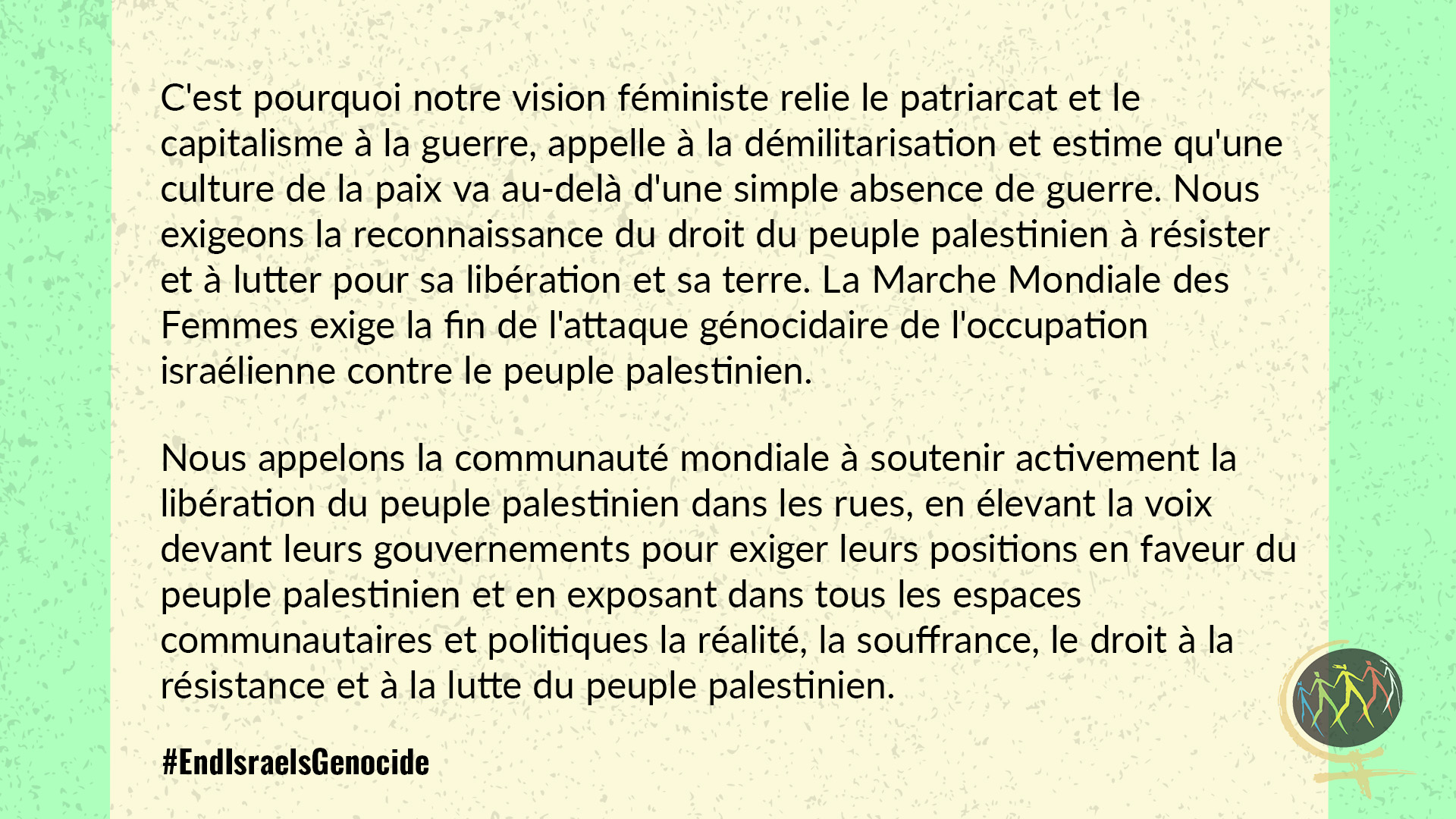 En ce 30 mars, Journée de la terre palestinienne, les femmes de Notre Amérique, d'Abya Yala, organisées dans le cadre de la Marche mondiale des femmes, vous écrivent dans l'espoir que nos mots d'encouragement et de solidarité parcourront le monde et vous atteindront à Gaza, en Cisjordanie et partout où l'exil cruel vous a emmenées.