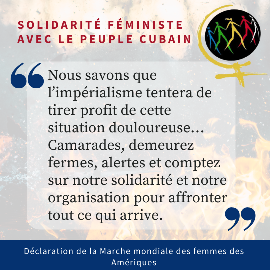 La MMF des Amériques exprime toute sa solidarité et son affection au peuple cubain, particulièrement aux camarades des organisations qui forment la Marche mondiale des femmes à Cuba et au peuple de Matanzas à la suite de l’incendie mortelle des super réservoirs de carburants dans la baie de Matanzas causée par la foudre le 5 août dernier.