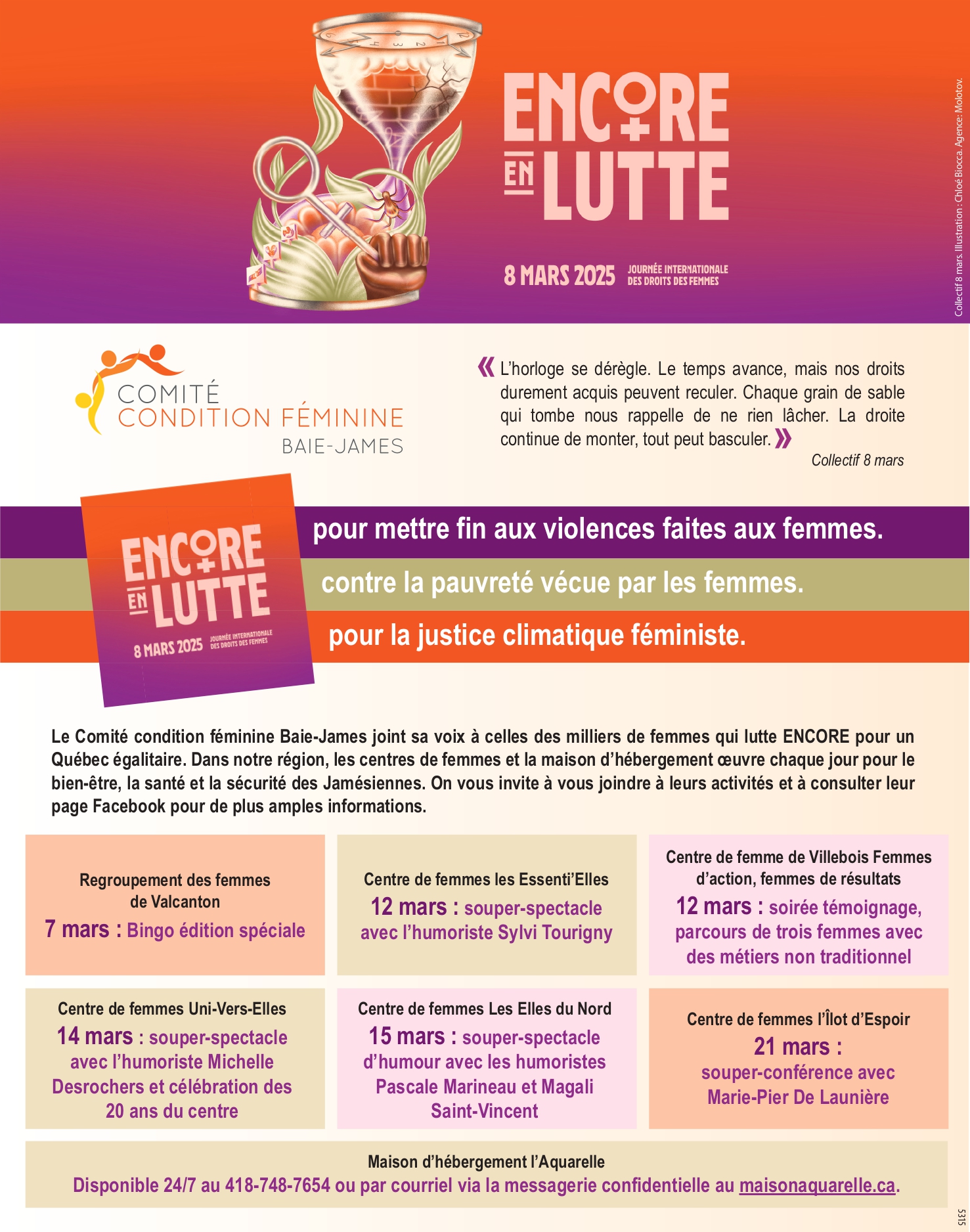 - Le Centre de Femmes du Témiscamingue avec la Maison d'Hébergement l'Équinoxe et le CALACS du Témiscamingue invites les femmes et leurs enfants à participer à la création d'une banderole collective pour souligner le début des activités de la Marche Mondiale des Femmes 2025.