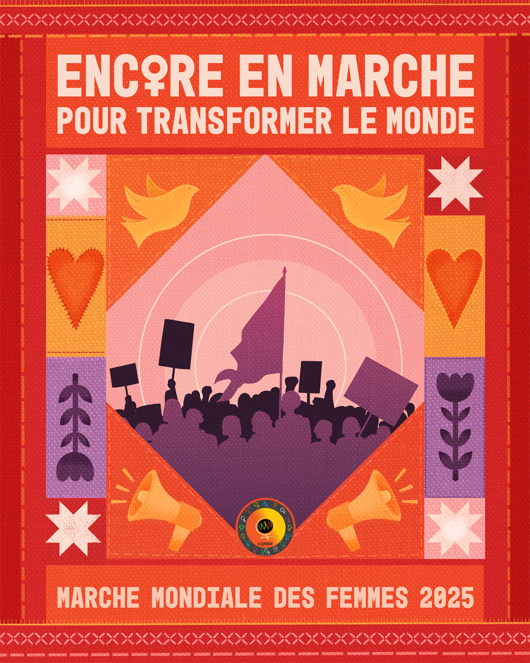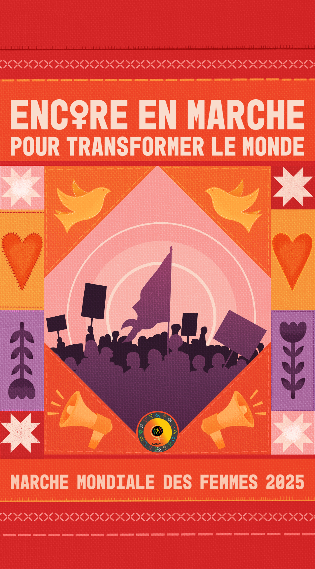 Maintenant que le lancement de la Marche mondiale des femmes vient d'être effectué, nous sommes ravies de vous dévoiler le visuel qui soutiendra notre mobilisation et nos prises de paroles jusqu'au grand rassemblement de la 6e action de la Marche mondiale des femmes au Québec. Ce visuel, portant notre thème "Encore en marche pour transformer le monde" est le résultat de nombreuses réflexions. Nous avons voulu créer une image qui non seulement représente notre thème, mais qui incarne également les valeurs et les luttes qui nous animent.