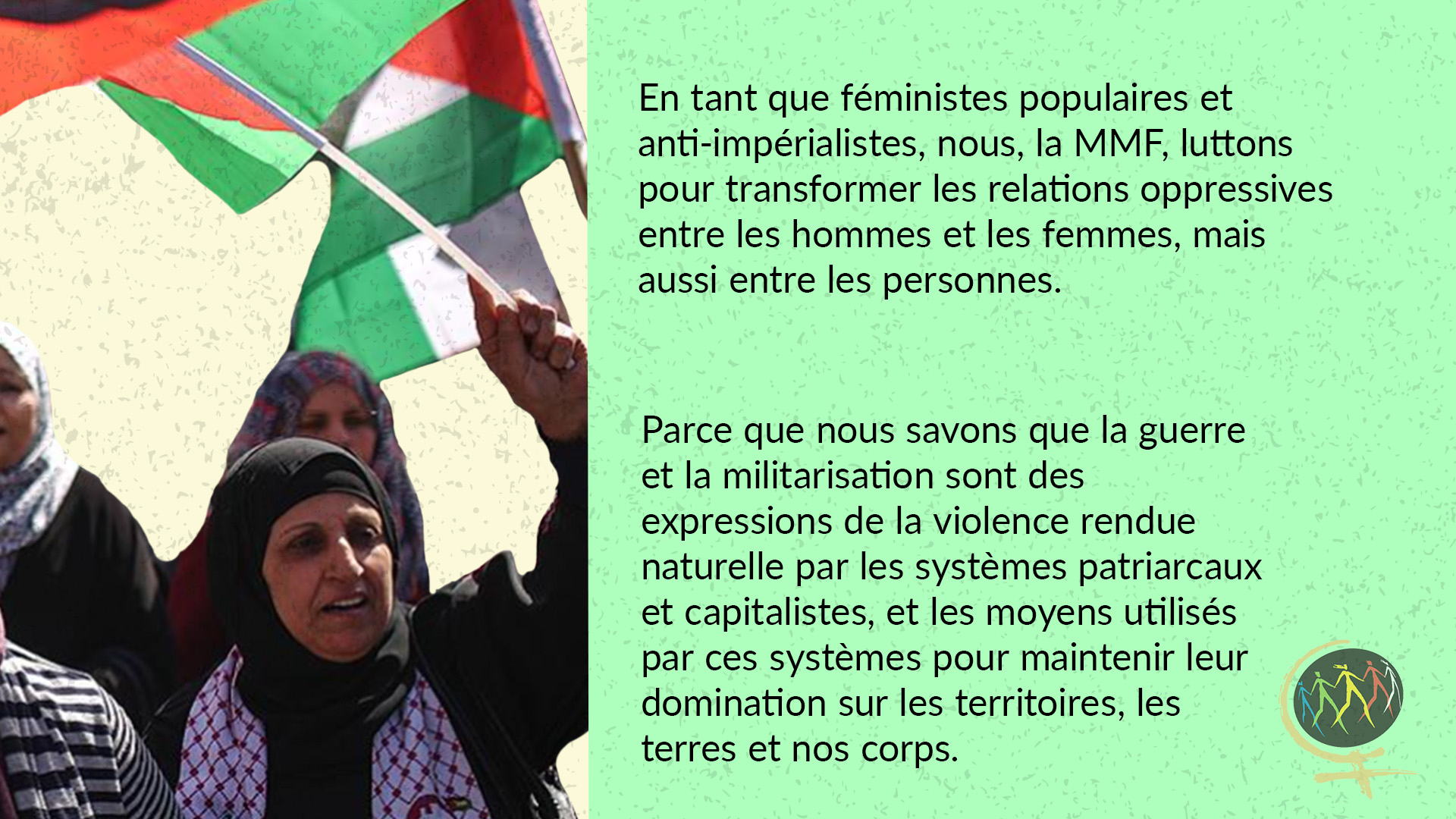 En ce 30 mars, Journée de la terre palestinienne, les femmes de Notre Amérique, d'Abya Yala, organisées dans le cadre de la Marche mondiale des femmes, vous écrivent dans l'espoir que nos mots d'encouragement et de solidarité parcourront le monde et vous atteindront à Gaza, en Cisjordanie et partout où l'exil cruel vous a emmenées.