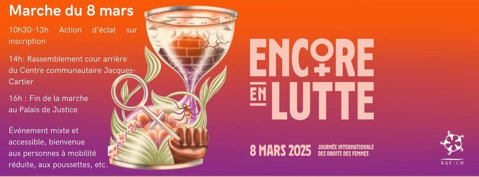 Le Regroupement des groupes de femmes de la Capitale-Nationale (RGF-CN)et ses groupes membres vous invitent à une marche accessible et ouverte à tout le monde pour cette journée. Cette année, le 8 mars 2025 se veut également le lancement des activités en lien avec la Marche mondiale des femmes 2025.