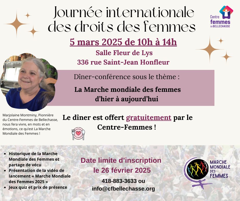 Le Centre-Femmes de Bellechasse, membre du RGFCA, invite à un dîner-conférence sous le thème : La Marche mondiale des femmes d’hier à aujourd’hui