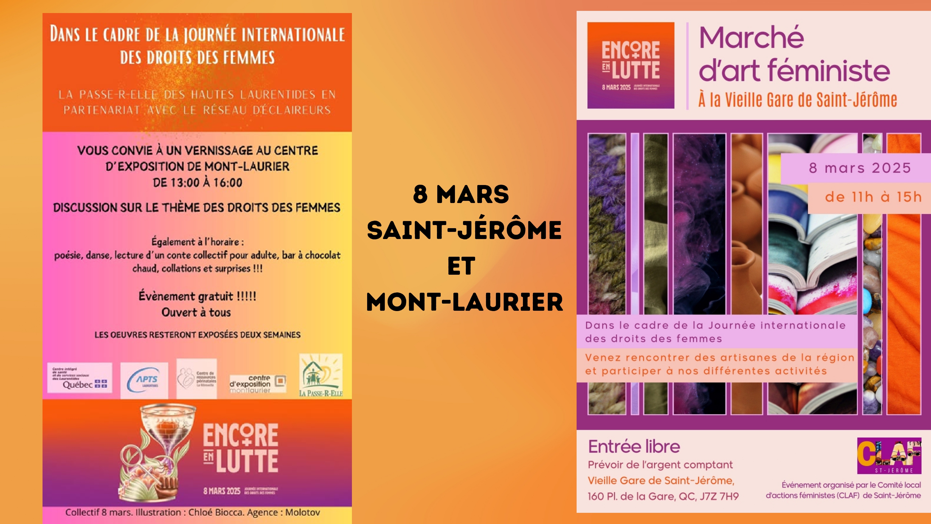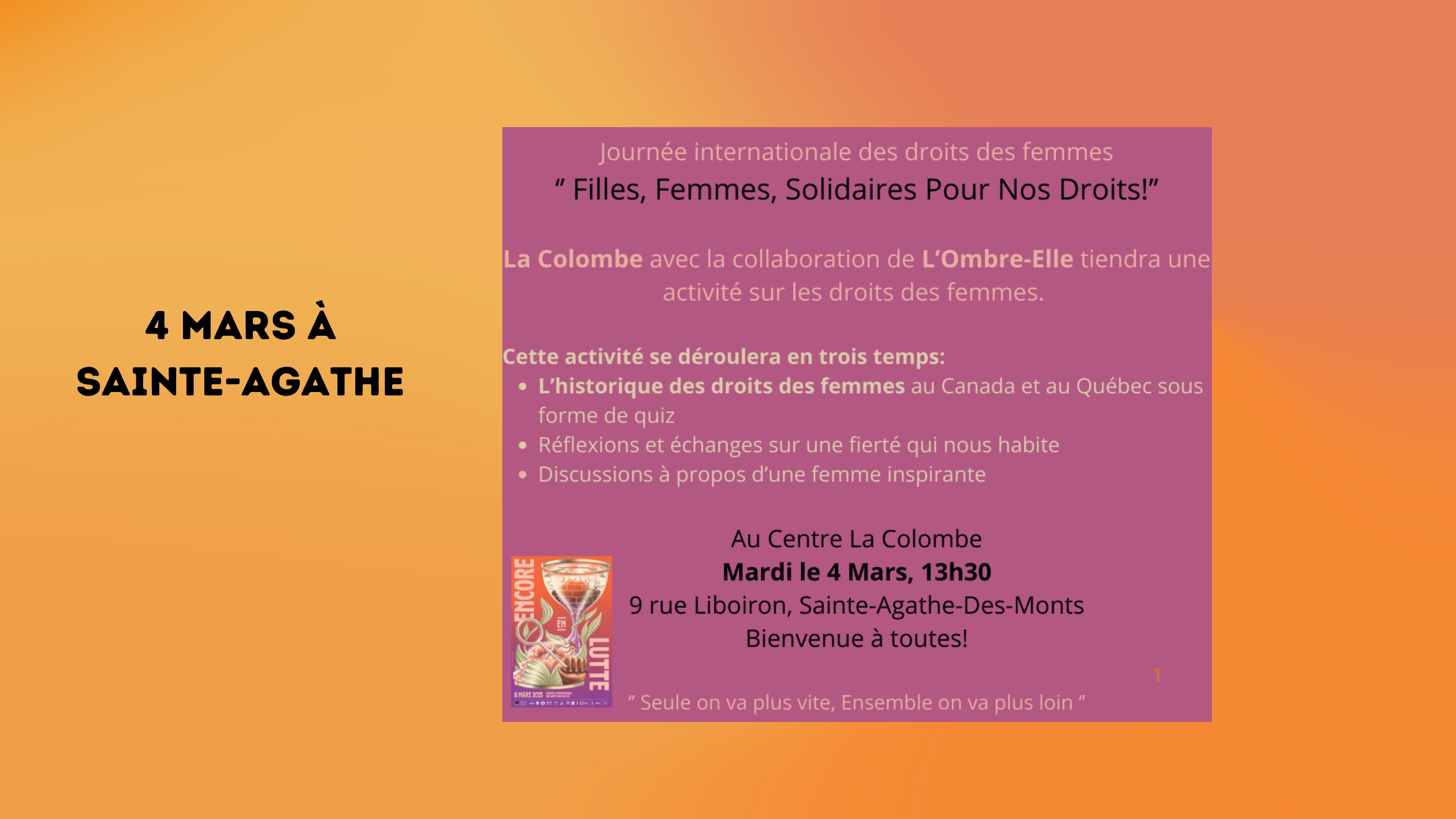 - Le Centre de Femmes du Témiscamingue avec la Maison d'Hébergement l'Équinoxe et le CALACS du Témiscamingue invites les femmes et leurs enfants à participer à la création d'une banderole collective pour souligner le début des activités de la Marche Mondiale des Femmes 2025.